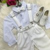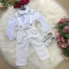 Conjunto Social Infantil Leo – Estilo e Elegância para Momentos Especiais Este conjunto social infantil é a escolha perfeita para deixar os pequenos elegantes e confortáveis em casamentos, batizados, aniversários, formaturas e cerimônias em geral.Com um visual sofisticado e moderno, é ideal para quem busca estilo com praticidade e ótimo caimento. Detalhes do Produto: Camisa social branca de manga longa, confeccionada em microfibra 100% poliéster, com toque macio, leve e confortável; Calça branco em twill 100% poliéster, com corte reto e caimento elegante; Gravata borboleta branco, combinando com o tom da calça; Suspensório branco com regulagem ajustável; Cinto branco com fivela metálica, ajustável. Atenção: Calçados e demais acessórios vendidos separadamente; Produto delicado: recomendamos lavagem à mão com sabão neutro; Tonalidade pode variar de acordo com o lote; As medidas podem variar em até 2cm. Recomendamos sempre consultar a tabela de medidas antes da compra para evitar erros. As cores do produto podem sofrer variações de tonalidade conforme a configuração da tela do seu dispositivo.