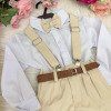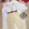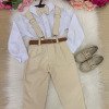 Conjunto Social Infantil Leo Bege com Suspensório Um conjunto elegante e atemporal, perfeito para ocasiões especiais como casamentos, batizados, aniversários e eventos formais. Tecidos Camisa: Microfibra 100% poliéster – leve, confortável e com ótimo caimento. Calça: Sarja 100% poliéster – estruturada, resistente e sofisticada. O conjunto é composto por: Camisa social branca de manga longa Gravata borboleta bege Calça bege Suspensório bege Cinto marrom A combinação de tons neutros traz elegância e versatilidade, permitindo composições clássicas e modernas. Informações Importantes Demais peças e acessórios da foto não estão inclusos. Calçados vendidos separadamente. Pode haver pequena variação de tonalidade do produto de acordo com a configuração da tela do seu dispositivo.