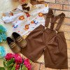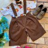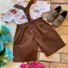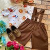 Conjunto composto por: Camisa Personagem, Shorts com suspensorio e gravata borboleta na cor Marrom. Demais peças ou acessórios, não inclusos.