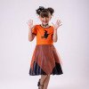 Fantasia Temática Halloween – Bruxinha Laranja com Tule Encante a criançada neste Halloween com essa fantasia super estilosa e divertida!O modelo traz a magia da data com estampa de bruxinha voando na parte superior e saia de tule laranja com brilho, sobreposta a tecido preto que dá um charme extra. O acabamento com gola preta e mangas curtinhas deixa o look ainda mais gracioso e confortável. Destaques do modelo: Fantasia temática Halloween Estampa de bruxinha Saia com tule laranja brilhante sobre tecido preto Gola e mangas com acabamento preto Confortável e cheia de movimento Ideal para festas, eventos escolares, truques ou travessuras e sessões de fotos inesquecíveis! Informações Importantes As medidas podem variar em até 2cm. Recomendamos sempre consultar a tabela de medidas antes da compra para evitar erros. Cuidado ao vestir: não forçar a entrada ou puxar o tecido, pois pode esgarçar a costura ➝ Não realizaremos troca por mau uso. Tiara e outros acessórios não acompanham o produto, mas estão disponíveis em nosso site. Calçado vendido separadamente, disponível na categoria Calçados. As cores do produto podem sofrer variações de tonalidade conforme a configuração da tela do seu dispositivo.