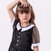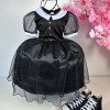 Fantasia Infantil Vandinha – Wandinha Apresentamos a Fantasia Infantil Wandinha, um modelo inspirado no estilo marcante da personagem mais querida da Família Addams. Esse vestido longo traz a essência gótica em uma versão delicada e sofisticada para as pequenas fashionistas. Detalhes do Produto Vestido preto com saia longa em tule leve e brilho sutil; Parte superior com gola branca clássica e botões frontais, remetendo ao estilo original da Vandinha; Mangas em tule transparente com acabamento moderno; Modelagem confortável que garante liberdade de movimentos.Informações Importante As medidas podem variar em até 2cm. Recomendamos sempre consultar a tabela de medidas antes da compra para evitar erros. Cuidado ao vestir: não forçar a entrada ou puxar o tecido, pois pode esgarçar a costura ➝ Não realizaremos troca por mau uso. Tiara e outros acessórios não acompanham o produto, mas estão disponíveis em nosso site. Calçado vendido separadamente, disponível na categoria Calçados. As cores do produto podem sofrer variações de tonalidade conforme a configuração da tela do seu dispositivo.