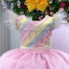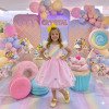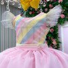 Vestido temático infantil Mini Miss, com busto em tons pastel e saia volumosa em tule rosa com pompons coloridos, criando um visual delicado e lúdico. Perfeito para diversos temas como: candy, doceria, circo, chuva de amores, chuva de bênçãos, jardim encantado, candy colors e arco-íris — ou seja, um único vestido que se adapta a várias propostas sem esforço. As mangas em tule leve criam um efeito suave e sofisticado, enquanto a saia rodada em camadas de tule rosa garante volume e movimento, deixando o look ainda mais encantador. O grande destaque fica por conta das aplicações de mini pompons coloridos distribuídos pela saia, adicionando um toque lúdico e divertido à peça. Cintura bem marcada, proporcionando um caimento impecável e valorizando a silhueta infantil com conforto. Ideal para festas, aniversários, sessões de fotos e momentos especiais onde o objetivo claramente é fazer todo mundo parar e olhar. Informações Importantes As medidas podem variar em até 2cm. Recomendamos sempre consultar a tabela de medidas antes da compra para evitar erros. Tecido 100% poliester Para um volume extra, indicamos o uso de saiote de armação, vendido separadamente na categoria Acessórios. Tiara e outros acessórios não acompanham o produto, mas estão disponíveis em nosso site. Calçado vendido separadamente, disponível na categoria Calçados