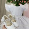 TECIDO 100% POLIÉSTER ESSE MODELO ACOMPANHA LAÇO BICO DE PATO 3 MARIAS,BABADO,BABADINHO Confeccionado em tecido misto possui forro em poliéster e algodão para não incomodar a criança e proporcionando um caimento incrível e sofisticado, possui gola redonda, comprimento médio, mangas curtas, contém, também, elástico nas costas para melhor ajuste, acabamento com lindo laço na parte posterior do vestido completa o look dos sonhos! * Medidas podem variar em até 4cm. * Caso queira o vestido mais armado, recomendamos o uso do saiote ou anágua de armação, disponível no nosso site na categoria acessórios. * Tiara vendida separadamente, disponível em nosso site na categoria acessórios. * Calçados vendido separadamente, disponível em nosso site na categoria calçados. * LEMBRANDO QUE PODERA HAVER VARIAÇÃO DE TONALIDADE DO PRODUTO DEPENDENDO DA TELA DO SEU DISPOSITIVO